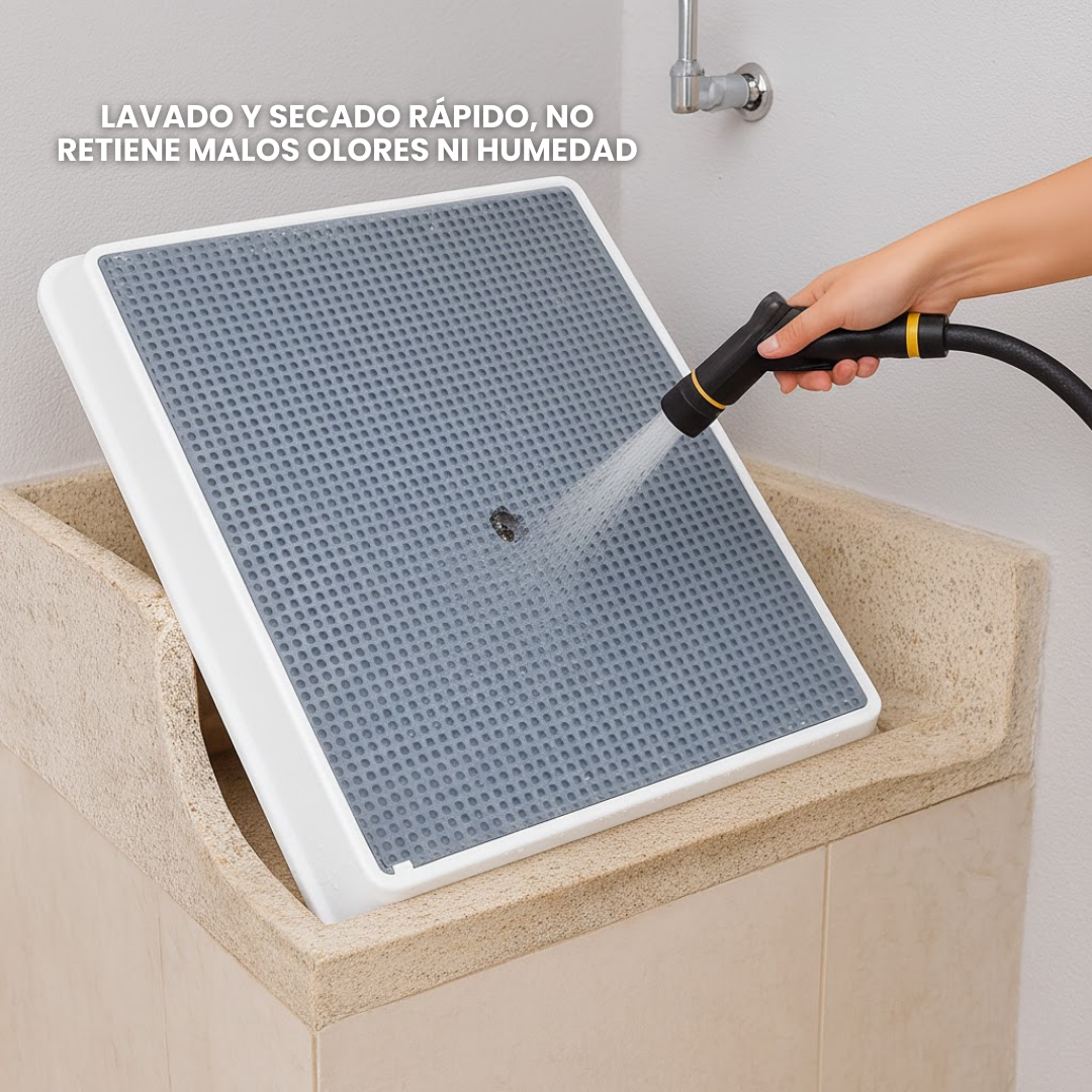 Su estructura elevada y su sistema de drenaje rápido evitan humedad, bacterias y malos olores, asegurando un entorno higiénico y saludable.