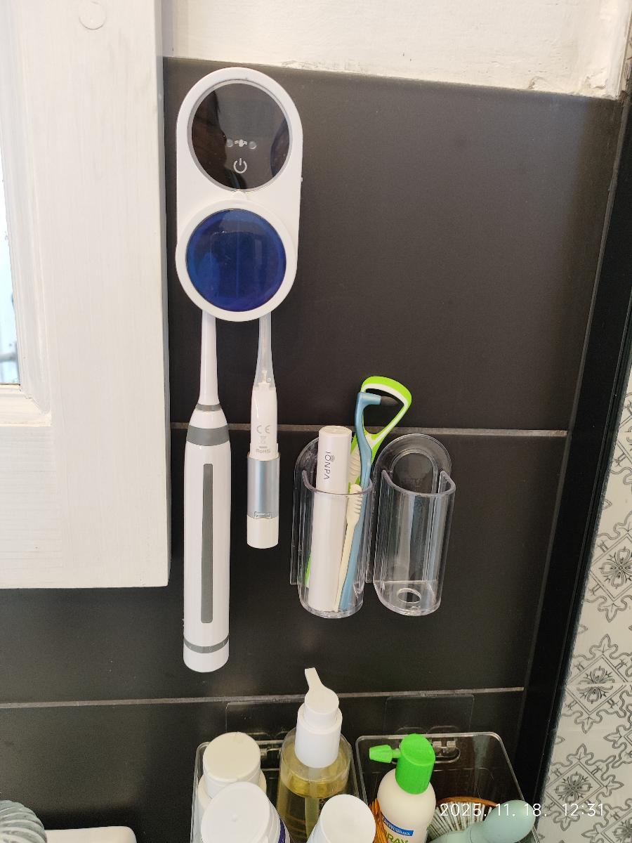 Sanitize elimina el 99.9% de bacterias con luz UV de doble espectro, seca tu cepillo automáticamente, lo protege del polvo y mantiene tu baño limpio y organizado con un soporte elegante y sin perforaciones.