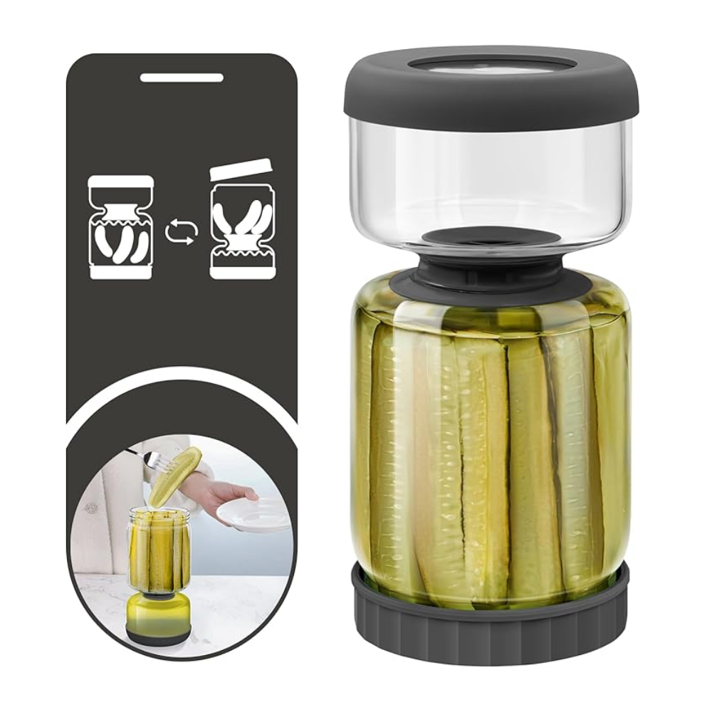 El tarro giratorio de vidrio de borosilicato que mantiene tus encurtidos siempre frescos, crujientes y sin desorden.